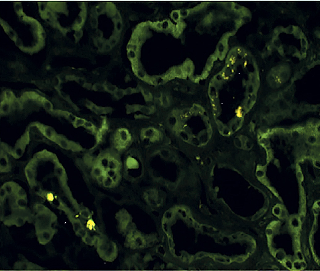По данным электронной микроскопии были выявлены кластеры частиц коронавируса в канальцевом эпителии проксимальных канальцев (рис. 2а) и подоцитах (рис. 2b). В 3 случаях были определены положительные антитела к ядерному белку SARS-CoV в эпителии канальцев по данным иммунофлюоресцентного анализа (рис. 3).
